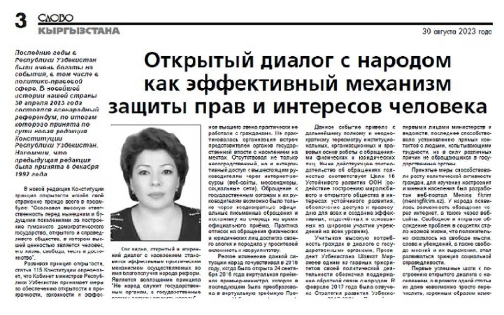 На сайте общенациональной газеты «Слово Кыргызстана» опубликована статья заведующей кафедрой Центра повышения квалификации юристов при Министерстве юстиции Узбекистана, доцента Севархон Мариповой под заголовком «Открытый диалог с народом как эффективный механизм защиты прав и интересов человека».