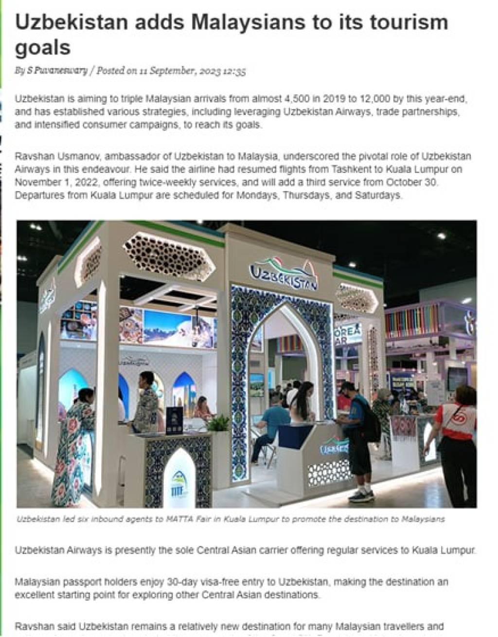 В статье отмечается, что Узбекистан стремится утроить число туристов из Малайзии с 4500 до 12 тысяч к концу этого года. Для достижения поставленных целей используются различные стратегии, в том числе развитие сети авиаперевозок и увеличение количества рейсов национальной авиакомпании «Uzbekistan Airways».
