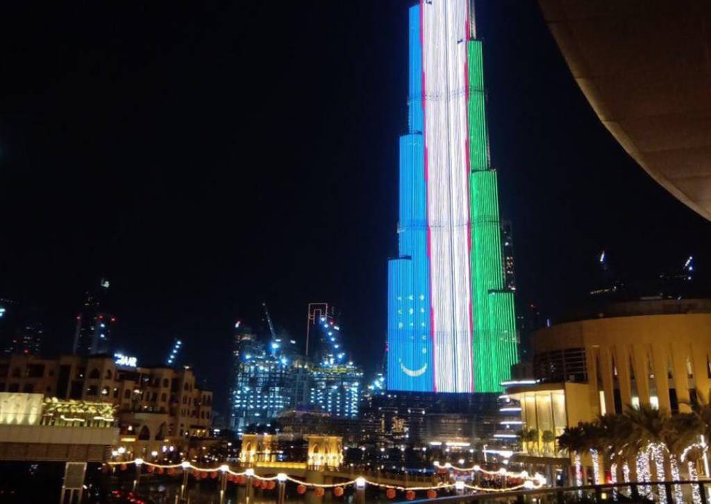 В Объединенных Арабских Эмиратах широко отметили 34-ю годовщину независимости Узбекистана. Самое высокое здание Абу-Даби – «Adnoc» – было расцвечено цветами флага Узбекистана, а в 20:20 самое высокое здание в мире – Бурдж-Халифа в Дубае – было окрашено цветами флага нашей страны.