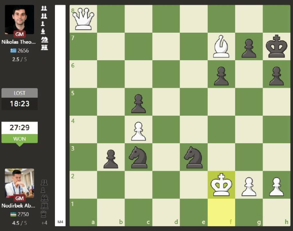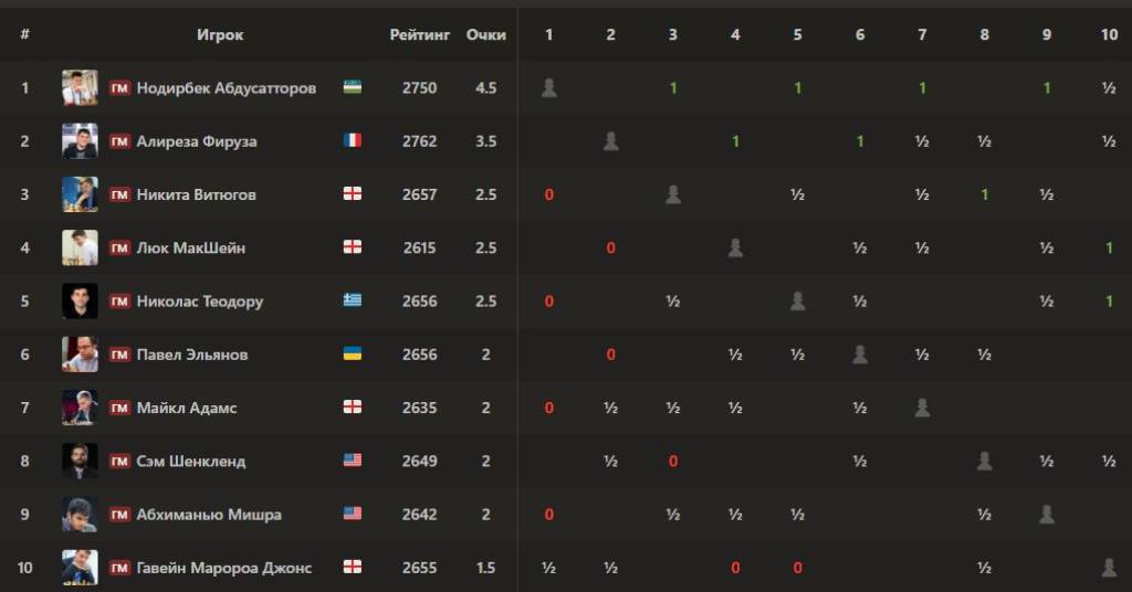 После этой победы Нодирбек стал единоличным лидером, увеличив свое преимущество до 4,5 очка. Француз Алиреза Фирузджа, набравший 3,5 очка, занимает 2-е место.