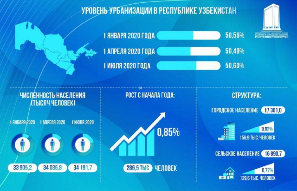 Постоянное население Республики Узбекистан по состоянию на 1 июля 2020 года составило 34 191,7 тысячи человек и с начала года увеличилось на 286,5 тысячи человек, или на 0,85 процента.