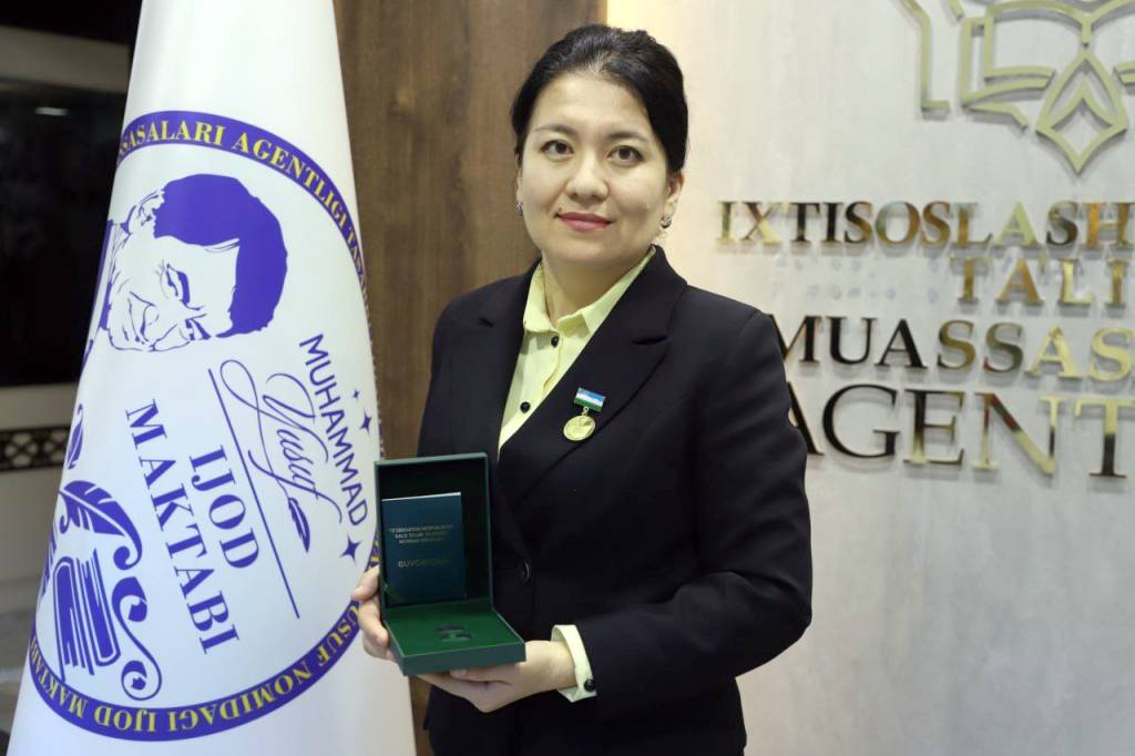 Дарҳақиқат, фаолияти давомида фидойилик кўрсатиб, самарали иш юритиб келаётган қаҳрамонимизнинг меҳнатлари эътироф этилиб, у ўтган йили “Маданият ва санъат фидойиси”,  жорий йилда эса Устоз ва мураббийлар куни муносабати билан Мактабгача ва мактаб таълими вазирлигининг “Халқ таълими аълочиси” кўкрак нишони билан тақдирланди.