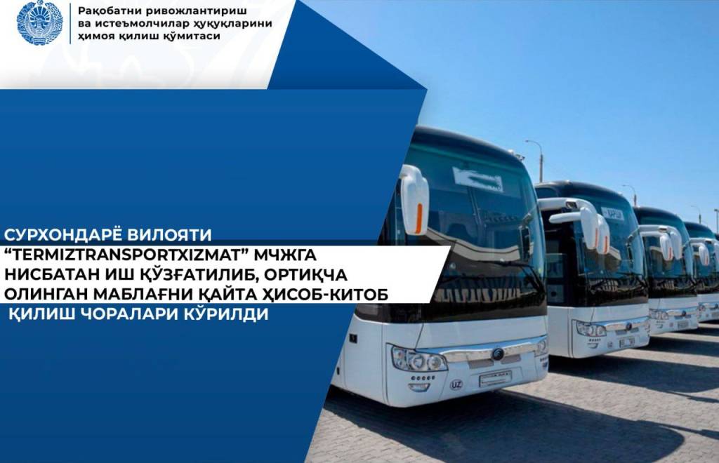 Управление надзорного органа по Сурхандарьинской области в ходе совместной с транспортной инспекцией проверки подтвердило факт нарушений. При установленной плате за проезд в 2000 сумов Termiztransportxizmat в течение 19 дней фактически взимала 3000 сумов.