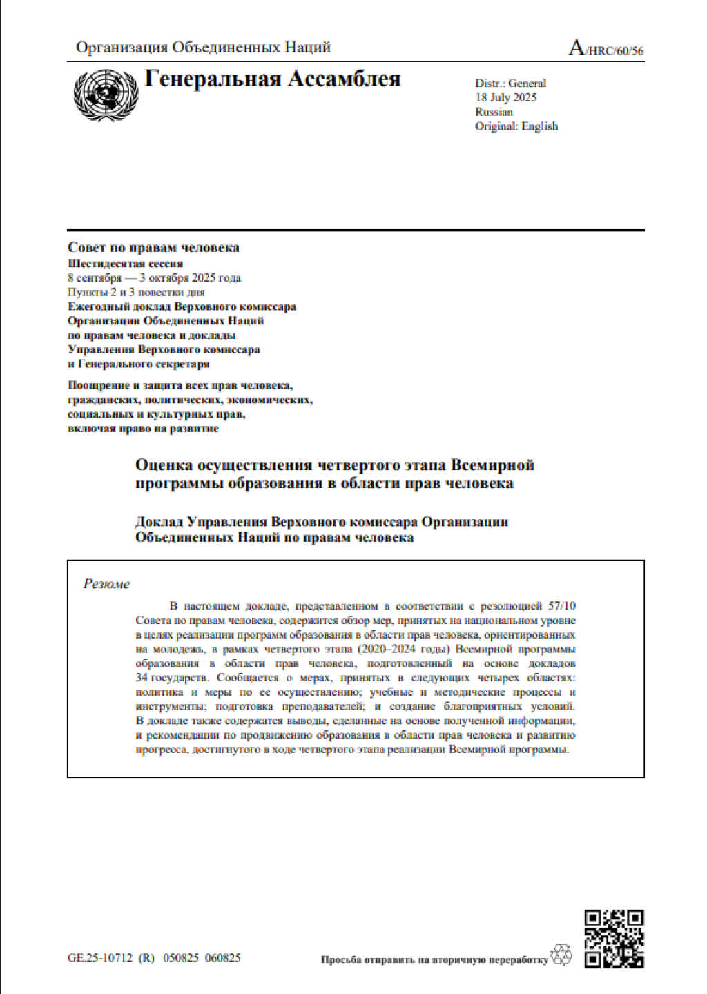 Инициативы Узбекистана по образованию в области прав человека отражены, в числе других, в документе Совета по правам человека (СПЧ) ООН, который представлен на рассмотрение сессии СПЧ. Она проходит в Женеве с 8 сентября по 8 октября 2025 года.