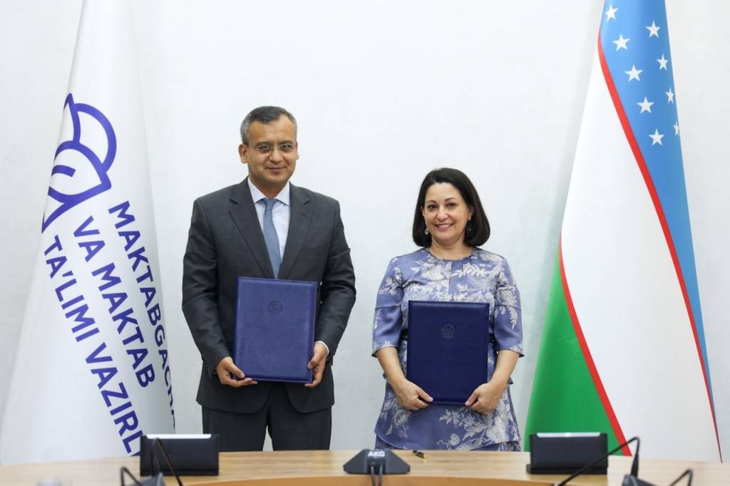 Министерство дошкольного и школьного образования Республики Узбекистан и ЮНИСЕФ объявили о подписании двух соглашений о партнерстве в реализации проектов общей стоимостью 19,2 млн долларов США. Проекты направлены на поддержку реформ и развитие качественного инклюзивного образования в нашей стране в рамках совместного проекта ИБР (IsDB), Исламского фонда солидарности (ISFD) и Глобального партнерства по образованию (GPE) - «Разумное финансирование образования» (ACG-GPE SmartEd).