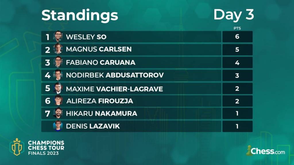 По результатам шести туров наш шахматист, набрав три очка, занимает четвертую строчку в турнирной таблице. Лидирует Уэсли Со – шесть очков, а бывший чемпион мира Магнус Карлсен с 5 очками занимает второе место. На третьем месте - Фабиано Каруана, набравший пять очков.
