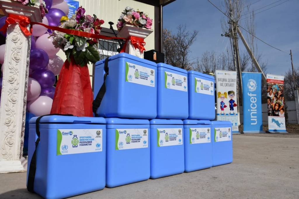 Начиная с 2017 года, ЮНИСЕФ оказал поддержку в открытии 21 склада вакцин по всему Узбекистану. В настоящее время 16 складов оснащены современным оборудованием, таким как противопожарная и охранная сигнализации, системы загрузки и выгрузки, холодильники, морозильники, приборы контроля температуры, холодильные комнаты и генераторы. Фонд предоставляет также защитную одежду для персонала. В начале текущего года планируется сдать в эксплуатацию еще пять складов.