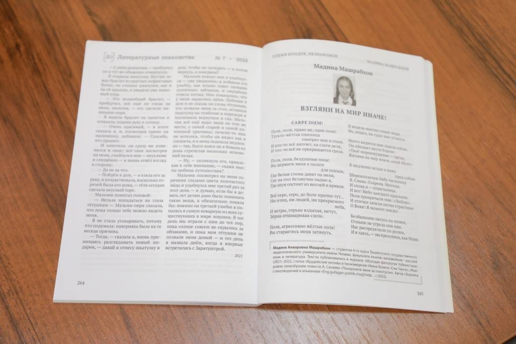 По данным информационной службы Союза писателей Узбекистана, три зааминские «ласточки» – Фарангиз Авазматова, Мадина Машрабхон и Тамила Хабиева – с подачи отдела международных литературных связей и перевода были удостоены публикации в популярном московском издании «Литературные знакомства» (главный редактор, учредитель и издатель – известный литературовед Лола Звонарева).