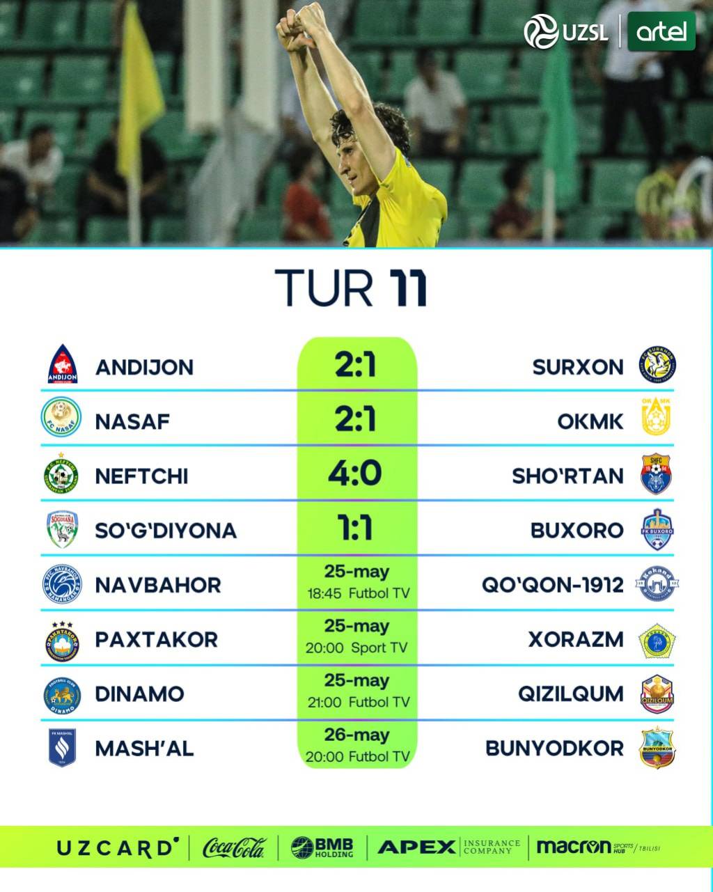 Бугун, 25 май куни “Навбаҳор” – “Қўқон-1912”, “Пахтакор” – “Хоразм”, “Динамо” – “Қизилқум” жамоалари ўзаро куч синашади.