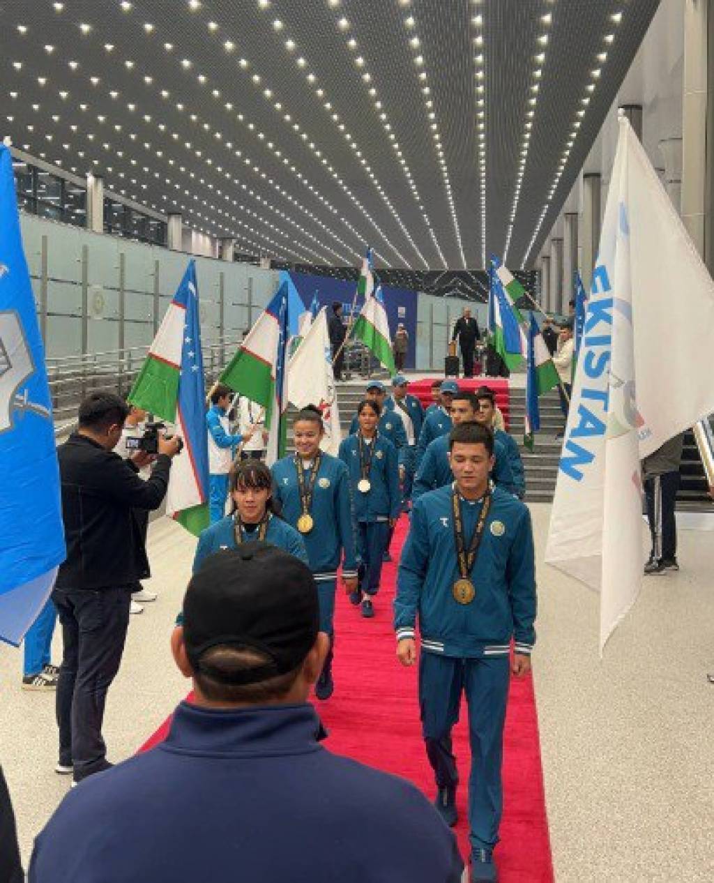 Сегодня в международном аэропорту Ташкента состоялась торжественная встреча наших спортсменов, успешно выступивших на III юношеских Азиатских играх в Бахрейне в дисциплинах кураш и пенчак-силат.