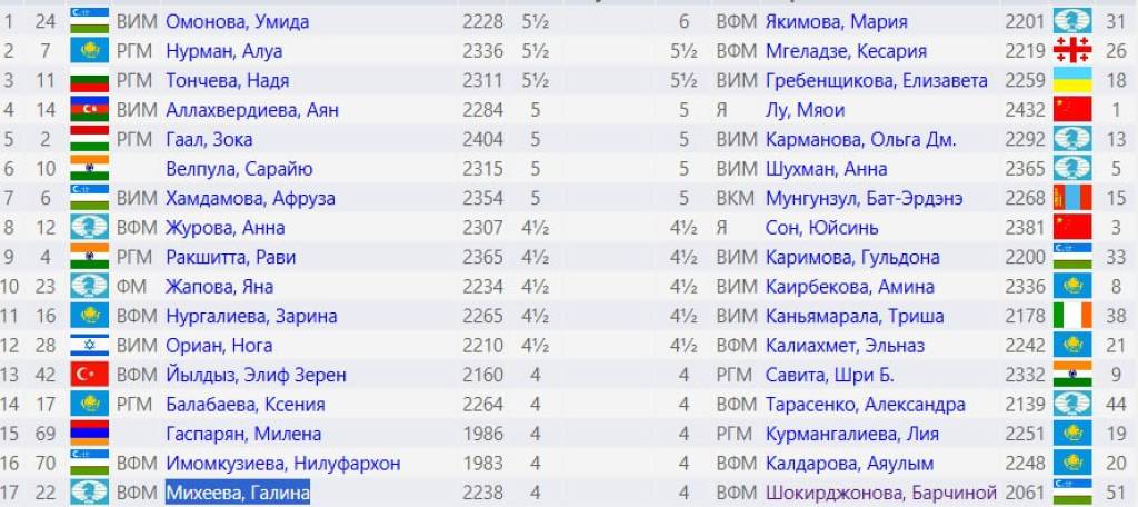 Среди 98 участниц чемпионата лидирует выступающая под флагом ФИДЕ Мария Якимова, у нее 6 очков. Последующие позиции занимают 5 шахматисток, на счету которых по 5,5 очка. Среди них Умида Омонова, по дополнительным показателям занимающая 3-е место. Талантливая шахматистка Афруза Хамдамова с 5 очками занимает 13-ю позицию. Гулдона Каримова набрала 4,5, Нилуфархон Имомкузиева и Барчиной Шокиржонова – по 4 очка.