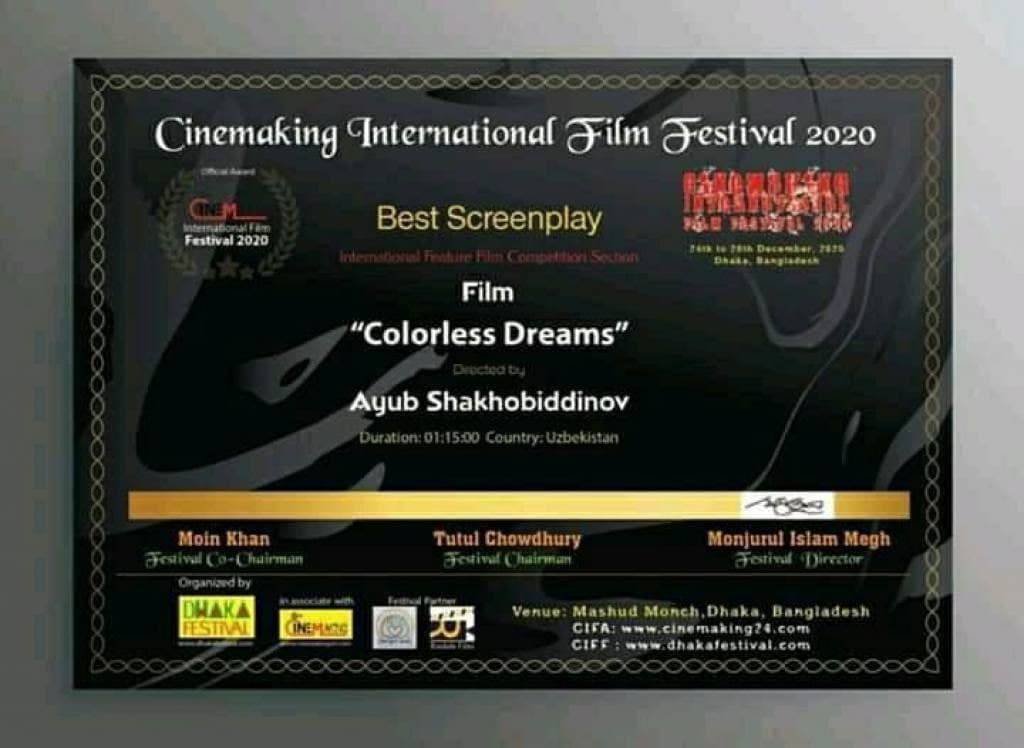 Фильм «Бесцветные сны», снятый по заказу Национального агентства «Узбеккино», стал победителем в номинации «Лучший сценарий» на международном фестивале кинематографии, прошедшем в Бангладеш.