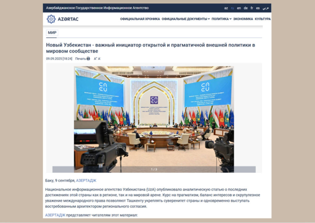 9 сентября текущего года на сайте Азербайджанского государственного информационного агентства АЗЕРТАДЖ (AZERTAC) была опубликована аналитическая статья под авторством корреспондента Национального информационного агентства Узбекистана – УзА (UzA) Абдуазиза Хидирова «Новый Узбекистан – важный инициатор открытой и прагматичной внешней политики в мировом сообществе».