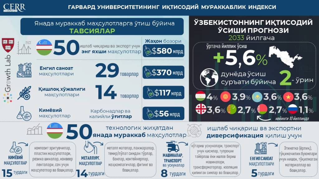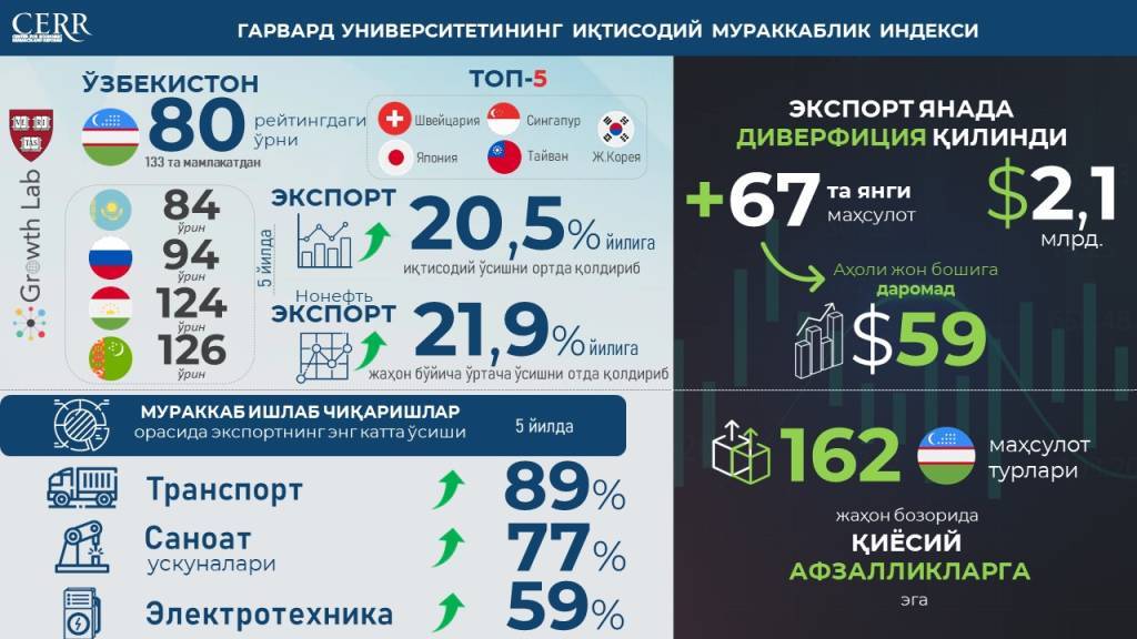 Узбекистан значительно улучшил свои позиции в рейтинге экономической сложности, поднявшись на 25 мест за последние пять лет и заняв 80-е место среди 133 стран. Турция занимает 44-е место, Вьетнам – 53-е, Казахстан – 84-е (потерял шесть позиций), Россия – 94-е (потеряла пять позиций), Таджикистан – 124-е (улучшил пять позиций), Туркменистан – 126-е (потерял 12 позиций). В ТОП-3 стран вошли Швейцария, Япония и Сингапур.