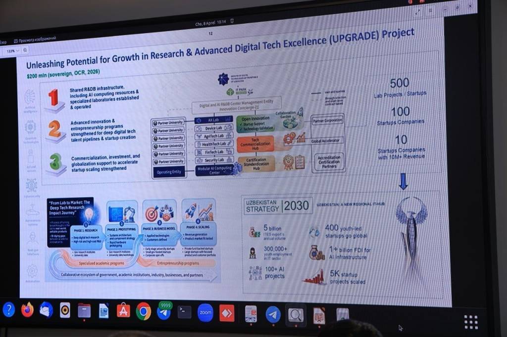 Uchrashuvda tomonlar loyihani dastlabki tashkiliy jarayonlari, joy tanlash va zaruriy kommunikatsiyalar bilan ta’minlanishi, shuningdek, loyihani bosqichma-bosqich amalga oshirish borasidagi takliflarni ko‘rib chiqdi. Hududda zamonaviy innovatsion ekotizim yaratish va yangi ish o‘rinlarini tashkil etish masalalari ham atroflicha muhokama qilindi.