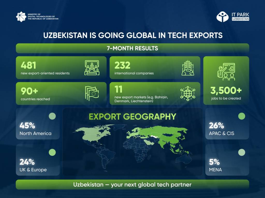 Экспортная география в текущем году расширилась на 11 направлений, включая Бахрейн, Данию и Лихтенштейн. Резиденты IT Park поставляют услуги более чем в 90 стран.