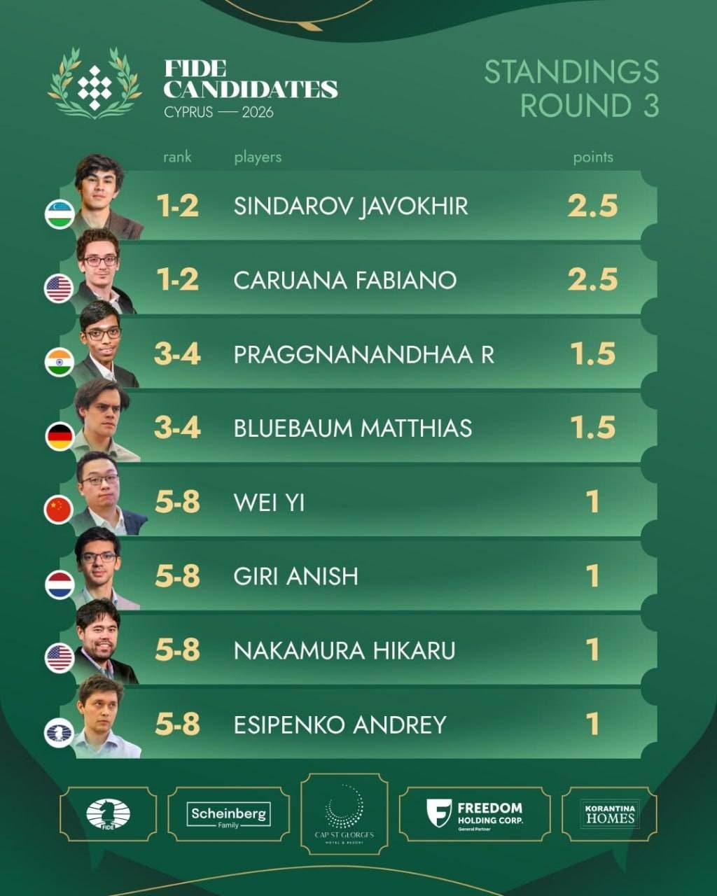 Турнирда 2,5 очко билан пешқадамлик қилаётган ҳамюртимиз Жавоҳир Синдоров ва АҚШ вакили Фабиано Каруана 4-турда рўбарў келади.