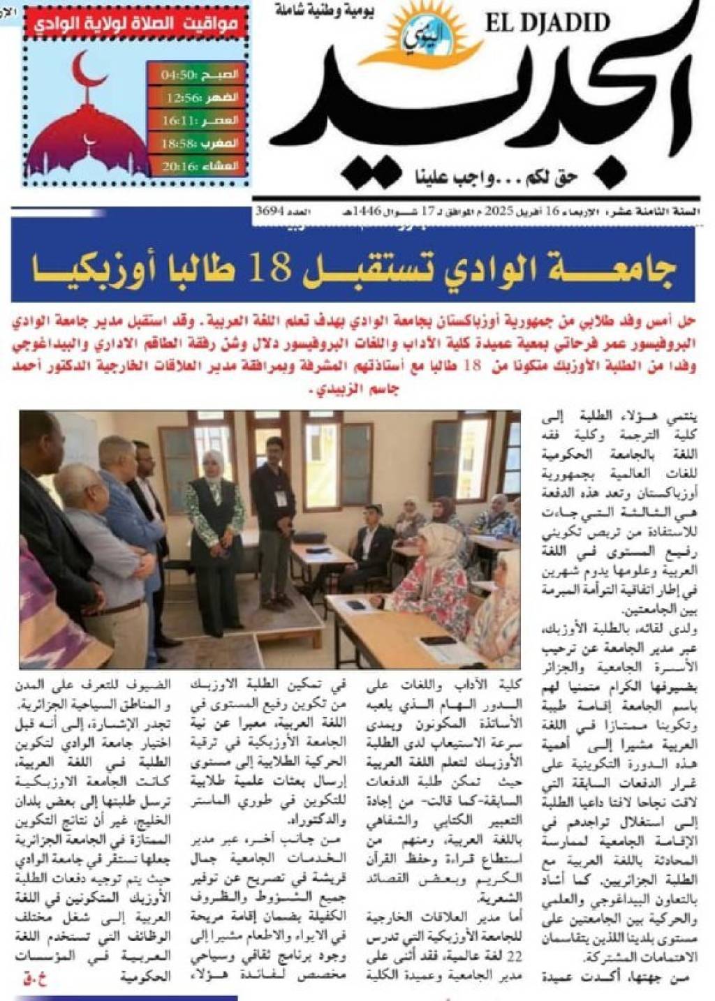 Жазоир Халқ Демократик Республикаси “Al-Jadid”, “Al-Nasr” каби етакчи нашрлари ёзишича, Ўзбекистон давлат жаҳон тиллари университетининг 18 нафар талабаси ушбу араб давлатига етиб келган. Ҳамюртларимиз мамлакат шарқида жойлашган Ал-Водий шаҳридаги Шаҳид Ҳама Лаҳдар университети Тиллар ва санъат факультетида очилган, араб тили ўргатиладиган икки ойлик тезкор ўқув курсига қабул қилинди.