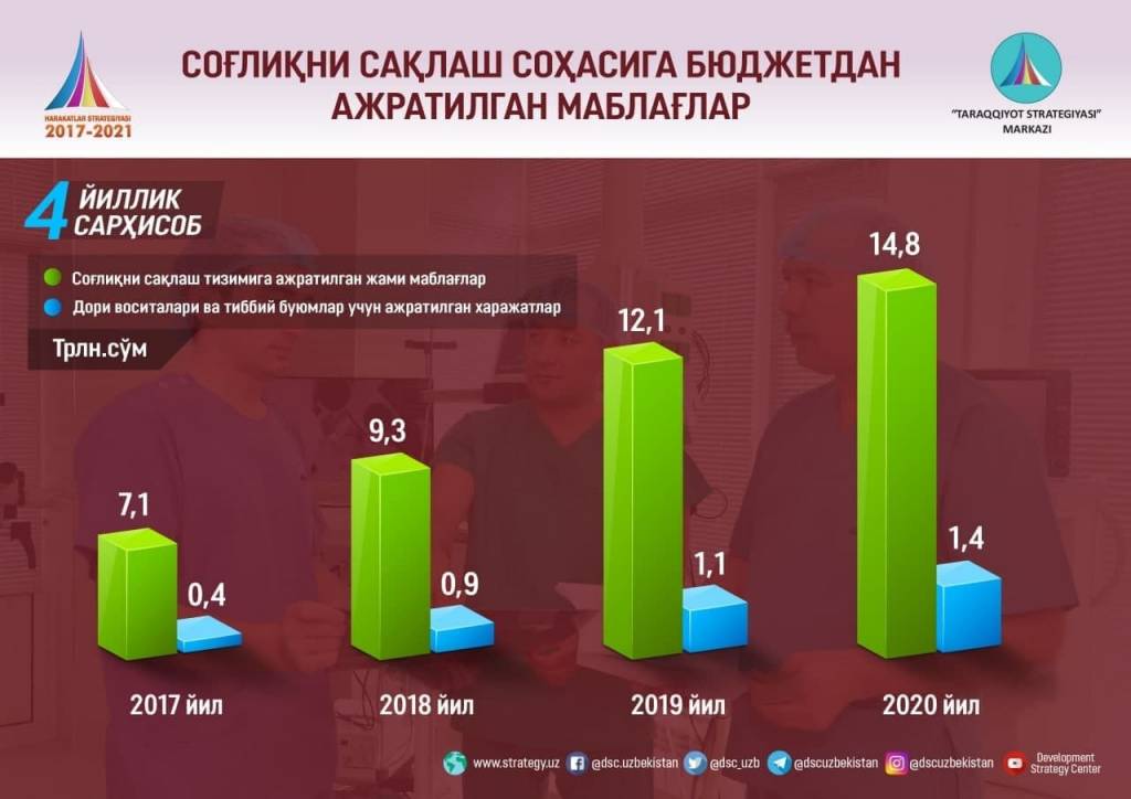 «Тараққиёт стратегияси» маркази томонидан тақдим этилган таҳлилга кўра, Ҳаракатлар стратегияси доирасида соғлиқни сақлаш соҳасидаги ислоҳотлар самарадорлигини ошириш учун 2017-2020 йиллар оралиғида соғлиқни сақлаш тизимига бюджетдан ажратилган маблағлар ҳажми 7,1 трлн.сўмдан 14,8 трлн.сўмга, дори воситалари ва тиббий буюмлар учун ажратилган харажатлар эса 0,4 трлн.сўмдан, 1,4 трлн.сўмга оширилган.