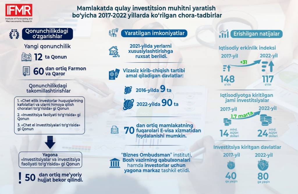 Прогнозлаштириш ва макроиқтисодий тадқиқотлар институти экспертларининг 2017-2022 йилларда Ўзбекистонда қулай инвестицион муҳитни яратиш бўйича амалга оширилган ишлар таҳлилига кўра, 2016 йилда фуқаролари мамлакатимизга визасиз кириб чиқа оладиган мамлакатлар сони 9 тани ташкил қилган. Виза тизими ислоҳ қилиниши натижасида бундай мамлакатлар сони 2022 йилда 90 тадан ортди. Шунингдек, инвесторлар ва уларнинг оила аъзолари учун алоҳида “инвестицион виза” тизими жорий қилинди.