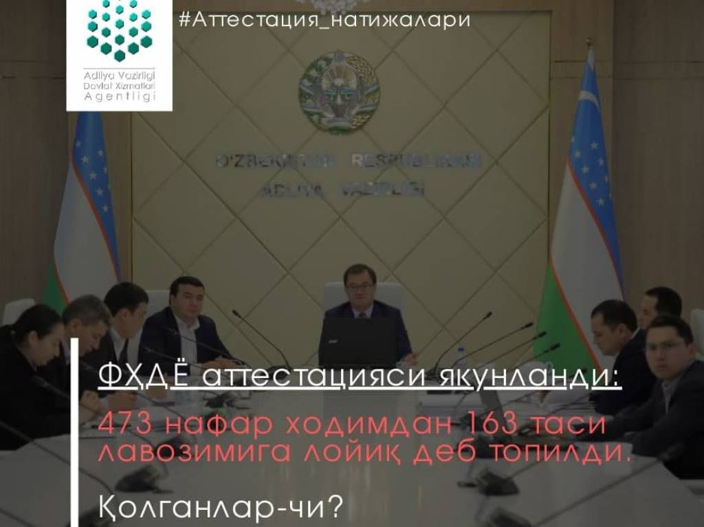 Бўлиб ўтган аттестацияда ходимларнинг 473 нафари иштирок этди. Шундан, 163 нафари эгаллаб турган лавозимига лойиқ деб топилди.