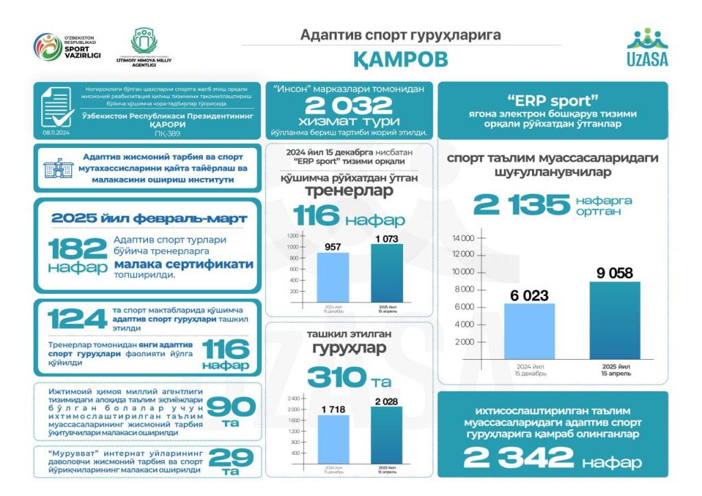 Мазкур ташаббус доирасида республика бўйлаб 254 та спорт мактабида қўшимча адаптив спорт гуруҳлари ташкил этилади. Шунингдек, 94 та олий таълим муассасасида ҳам янги адаптив спорт гуруҳлари фаолиятини бошлайди.