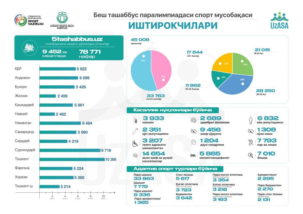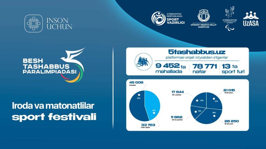 Шу билан бирга, ногиронлиги бўлган фуқароларнинг спорт мусобақаларида иштирокини соддалаштириш мақсадида 5tashabbus.uz платформаси Тиббий-ижтимоий эксперт комиссиясининг электрон хизматлар базаси билан интеграция қилинди. Бу орқали тарихда илк бор, ҳудудларда олиб борилган кенг қамровли тарғибот ва ташвиқот ишлари натижасида 78 минг 771 нафар ногиронлиги бўлган фуқаро мазкур спорт мусобақаларида иштирок этиш истагини билдирган ҳолда электрон ариза топширди.