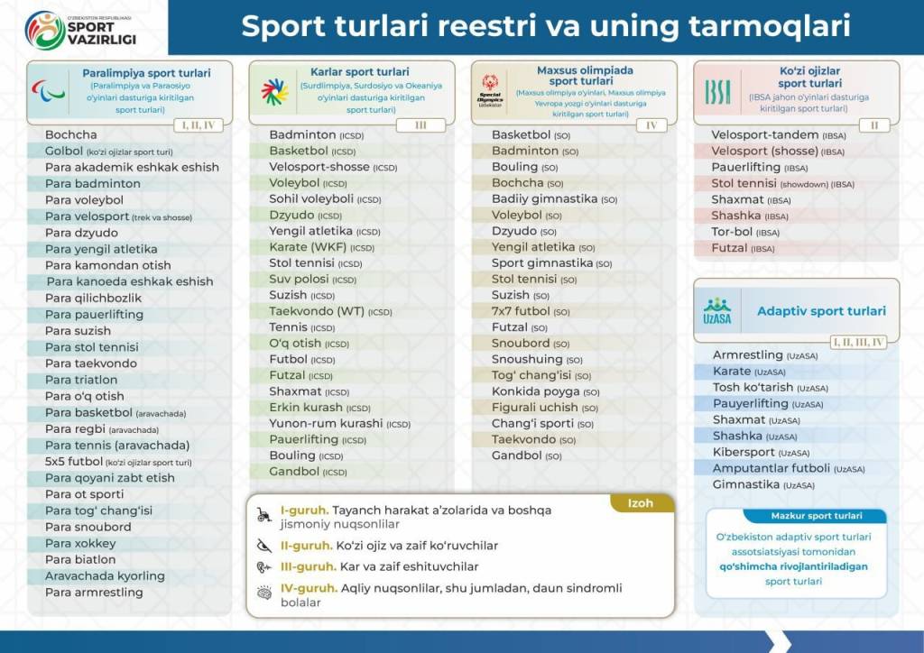 Мазкур саъйи-ҳаракатлардан келиб чиқиб, Спорт вазирлиги томонидан адаптив спорт турлари, жумладан, паралимпия, сурдлимпия, махсус олимпиада ва кўзи ожизлар спорт турлари реестри ва унинг тармоқлари тасдиқланди.