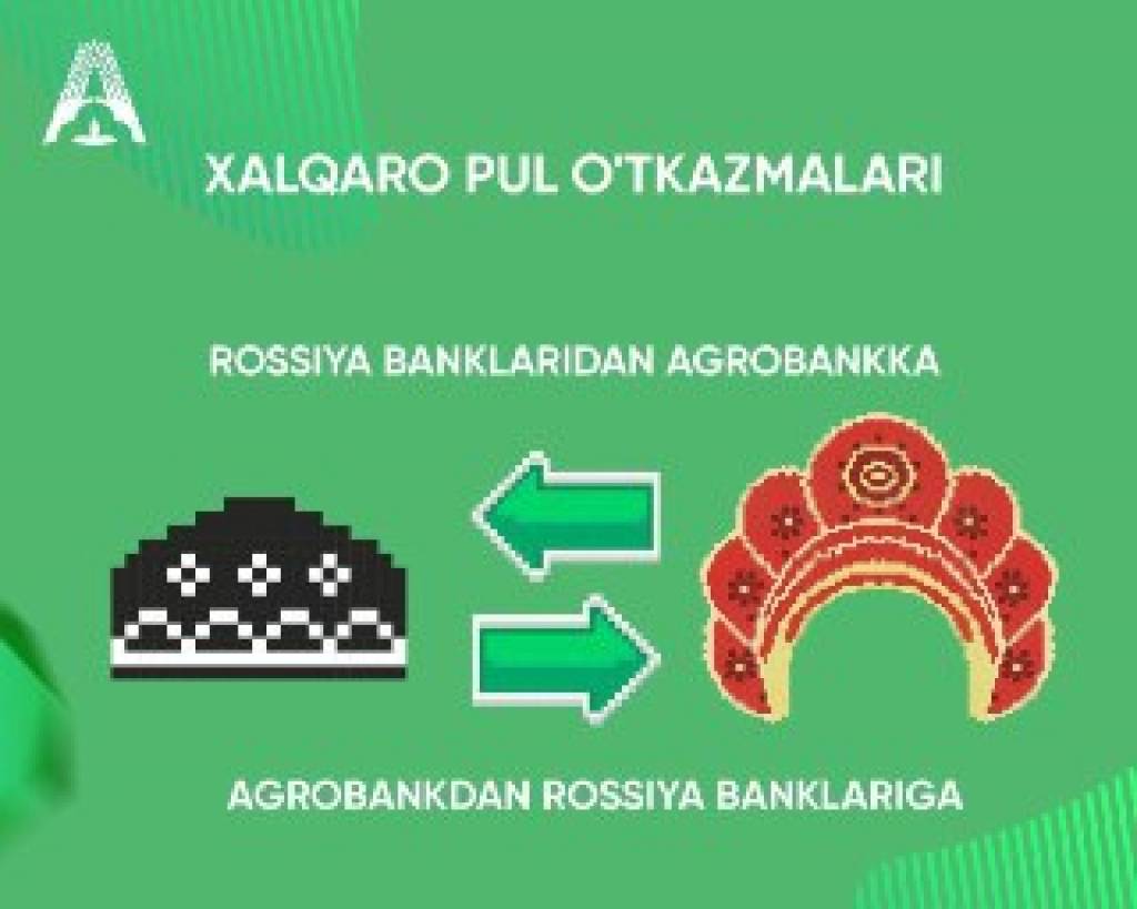 Пул ўтказмасини Россиянинг исталган банки томонидан чиқарилган Visa, MasterCard ва Mir карталари орқали Агробанкнинг Humo ва UzCard карталарига юбориш ҳамда қабул қилиш мумкин!