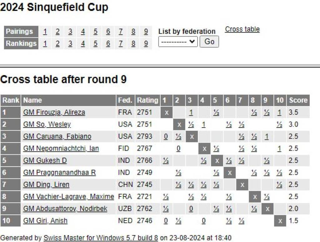 Nufuzli turnirda peshqadamlik qilayotgan Fransiya vakili Alireza Firuzja oq donalarda so‘nggi o‘rinda ketayotgan niderlandiyalik Anish Girini mag‘lubiyatga uchratib, o‘z mavqeini mustahkamladi. Ushbu g‘alabadan keyin Alireza 3,5 ochko bilan yakka yetakchiga aylandi. Amerikalik Uesli So 3 ochko bilan keyingi o‘rinda bormoqda.