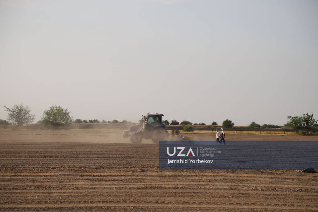 Айни кунларда ғалладан бўшаган ер майдонларига ҳам тажриба асосида 90 кунлик чигит уруғи қадалмоқда.