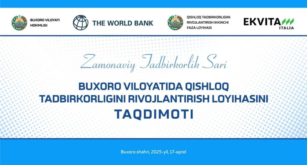 Мазкур тадбир “Жаҳон банки”, Бухоро вилояти ҳокимлиги, Қишлоқ тадбиркорлигини ривожлантириш “иккинчи фаза” лойиҳаси ҳамда “Эквита Италия” халқаро консультация компанияси кўмаги билан Бухорода бўлиб ўтди.