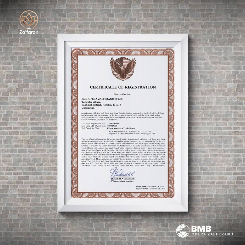 АҚШ озиқ-овқат маҳсулотлари ва дори воситаларини назорат қилиш бошқармаси томонидан “BMB HOLDING”нинг “BMB Opera Zafferano” корхонасига заъфарон маҳсулотини Қўшма штатларга экспорт қилиш имкониятини берадиган FDA рухсатномаси тақдим этилгани ҳақида хабар берган эдик. Эндиликда ушбу рухсатноманинг муддати узайтирилди.