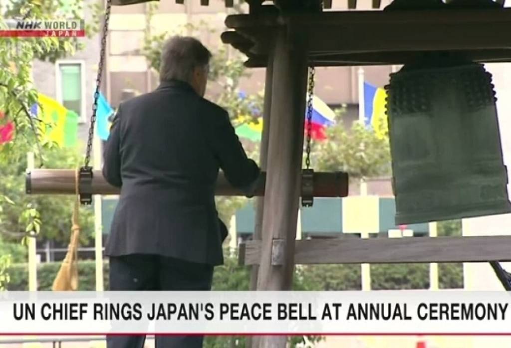 Аъзо давлатлар йиққан тангалардан ясалган мазкур қўнғироқ 1954 йил тинчлик фаоли Накагава Тиёдзи томонидан совға қилинган. Маросимда Накагаванинг қизи Такасе Сэйко ва Япониянинг БМТдаги доимий вакили Исикане Кимихиро ҳам қатнашди. Қўнғироқни чалишдан олдин, Гутерриш нутқ сўзлаб, тинчлик фақат ҳукуматлар ёки Президентлар масъулияти эмас, балки ҳар биримизга тегишли масала эканини эслатган.