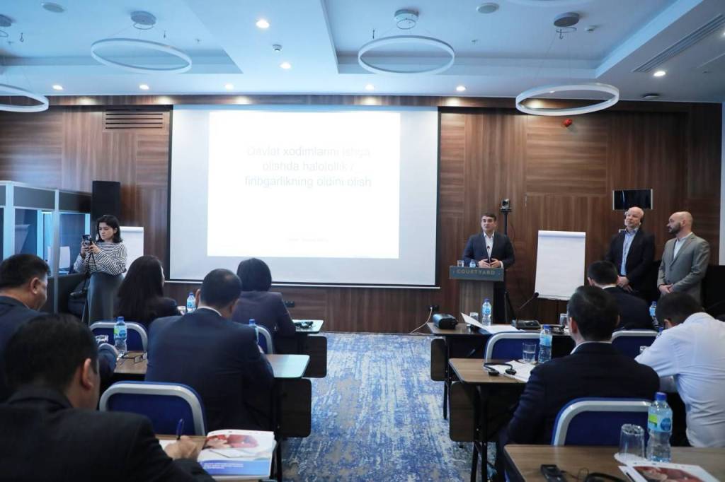 Тренингда Германиядан таклиф этилган халқаро эксперт И.Зоргац иштирок этиб, ходимларни ишга қабул қилиш жараёнларида этник меъёрлар, камситмайдиган процедуралар, манфаатлар тўқнашувини бартараф этиш усуллари ва мувофиқликни назорат қилиш воситалари ҳақида тўлиқ маълумот тақдим этди.