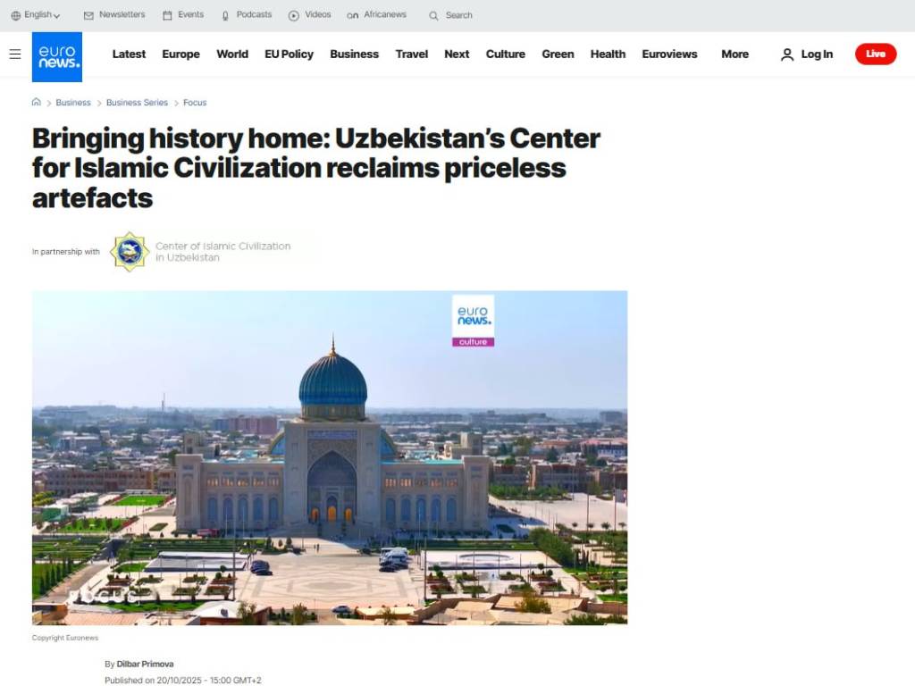 Эришилаётган натижаларни кузатган ҳолда нуфузли халқаро ахборот агентлиги – Euronews юртимиз ўзининг бой маданий меросини сақлаш ва тиклаш йўлида Ўзбекистондаги Ислом цивилизацияси маркази орқали фаол иш олиб бораётганлигини эътироф этди.