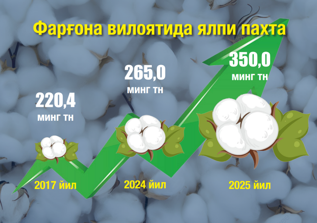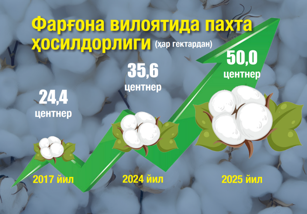 Лекин амалга оширилган ислоҳотлар, тармоққа илм кириб келиши, янги нав уруғлари ва экиш услубидаги ўзгаришлар пировард натижада гектаридан олинаётган пахта миқдорини кескин оширди. Агар 2017 йилда ҳар гектаридан ўртача ҳосил 23,3 центнерни ташкил этган бўлса, 2024 йилда 35,6 га етди. 2024 йилда ялпи ҳосил 2017 йилдаги 220,4 минг тоннага нисбатан 44,6 минг тоннага кўпайиб, 265,0 минг тоннани ташкил этди. 2025 йил эса кескин ўсиш йили бўлди. Шартнома 313,2 минг тонна, аммо амалда ҳисоб-китобларга қараганда 350 минг тонна пахта ҳосили етиштирилган. Кутилаётган ҳосилдорлик эса режадаги 43,5 центнер ўрнига 50,0 центнер бўлади, дейишмоқда мутахассислар.