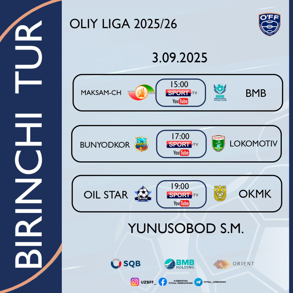 Бугун, 3 сентябрь куни 1-турнинг иккинчи кунги ўйинлари ташкил этилади. Олий лига баҳслари учун ташланган қўръага кўра, унда “Максам-Чирчиқ” - BMB (Жиззах), “Бунёдкор” (Тошкент) - “Локомотив” (Тошкент), ОКМК (Олмалиқ)- “Oil Star” (Бухоро) жамоалари куч синашади.