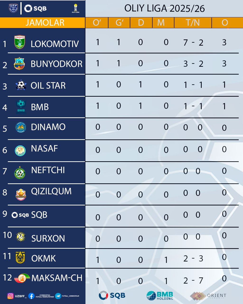 Эслатиб ўтамиз, Олий лига 1-тур ўйинлари 7 сентябрга қадар давом этади.