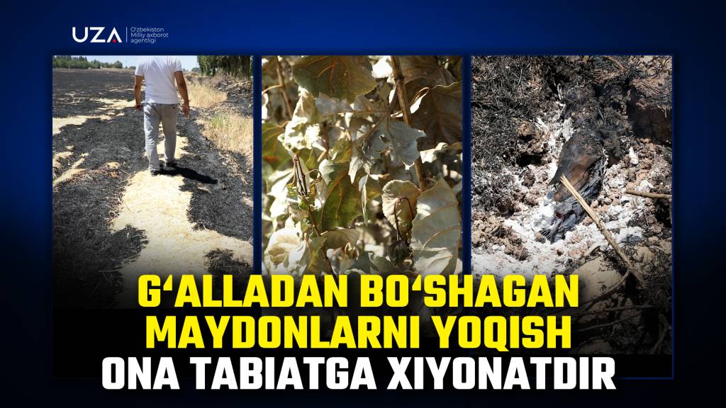<iframe width="650" height="420" src="https://www.youtube.com/embed/EmuQpvS64aA" title="G‘alladan bo‘shagan maydonlarni yoqish – Ona tabiatga xiyonatdir" frameborder="0" allow="accelerometer; autoplay; clipboard-write; encrypted-media; gyroscope; picture-in-picture; web-share" referrerpolicy="strict-origin-when-cross-origin" allowfullscreen></iframe>Санжар Тошпўлатов, Аброр Содиқов, Улуғбек Тўхтаев, ЎзА