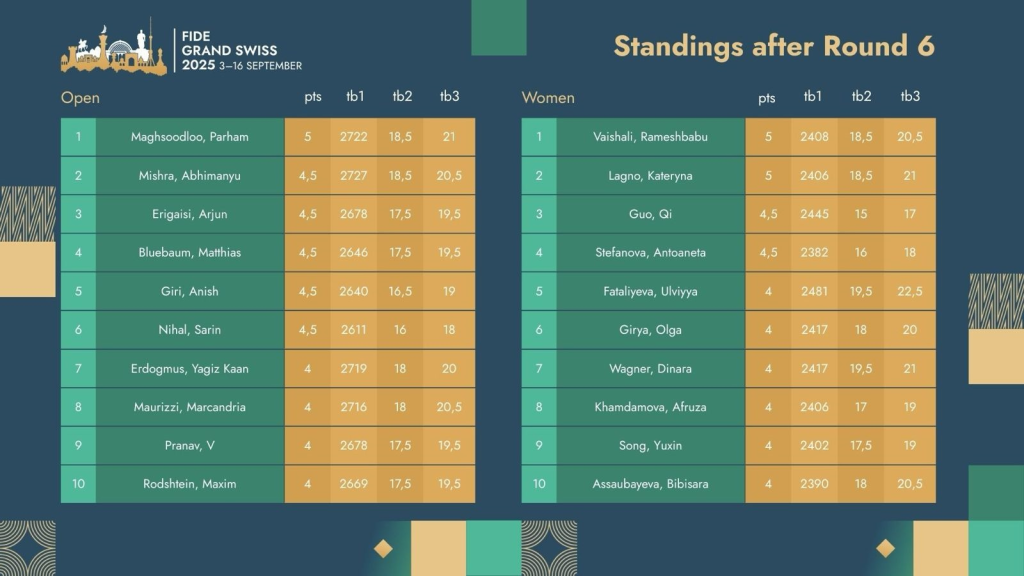 Ортда қолган турлар сарҳисобига кўра, 4 очкога эга ҳамюртларимиз Нодирбек Абдусатторов ва Нодирбек Ёқуббоев, аёллар турнирида 8-ўринда бораётган Афруза Ҳамдамова ҳали совринли ўринлардан бирини эгаллаш имкониятидан мосуво бўлганича йўқ.