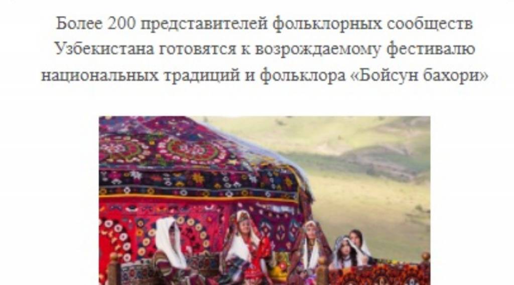 «2001 йил Бойсун ЮНEСКО томонидан инсониятнинг номоддий маданий мероси дурдонаси сифатида эътироф этилган. 2002 йил май ойида эса туманда Ўзбекистон, Тожикистон ва Қирғизистон халқ ижрочиларининг биринчи очиқ фольклор фестивали бўлиб ўтган», деб ёзади муаллиф.