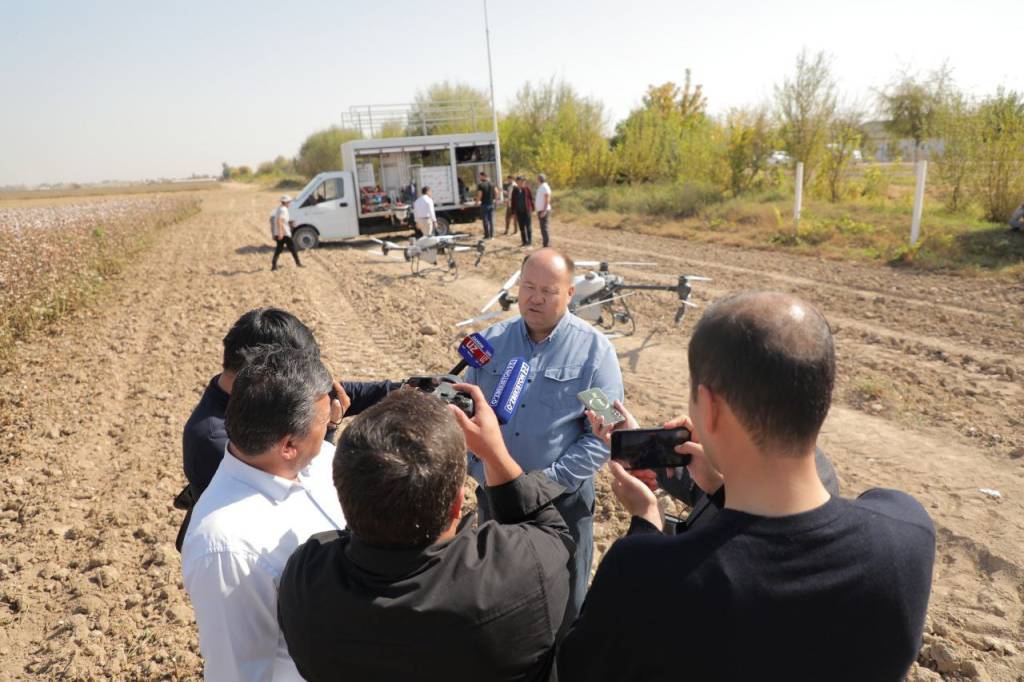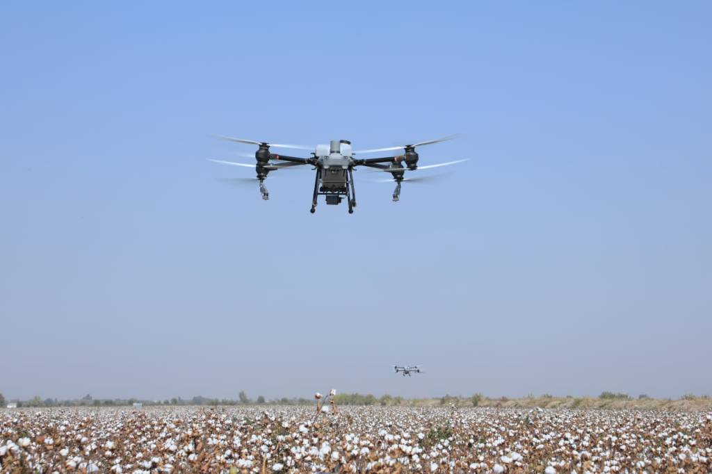 Мазкур майдондаги ғўзаларга агротехник ишлов бериш жараёнида “Ўздаверлойиҳа” институти билан тузилган шартнома асосида учувчисиз учиш қурилмалари — дронлар самарали қўлланилмоқда.