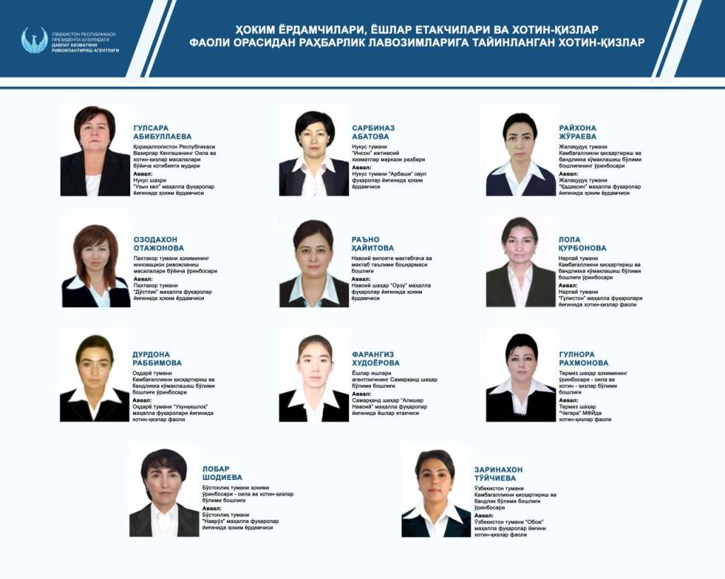 Номзодлар учун махсус Дастур тайёрланиб, малакаси оширилди ва уларни турли масъул лавозимларга тайинлаш жараёнлари бошланган. Қуйида хотин-қизлар орасидан масъул вазифаларга тайинланган номзодлар ҳақида маълумот тақдим қилинди.