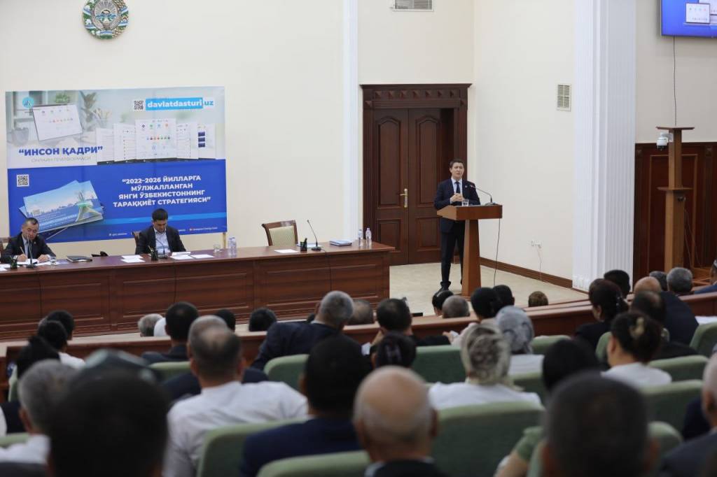 Унда вилоят ҳокимининг биринчи ўринбосари Ф. Маманов, халқ депутатлари вилоят кенгаши депутати С.Абдураимов, “Тараққиёт стратегияси” марказининг бўлим бошлиғи Ж. Шарипов, А. Холбеков, Олий Мажлис Сенати аъзоси А. Соатов, “Юксалиш” умуммиллий ҳаракати вилоят бўлими раҳбари Г. Амирова, вилоят ахборот ва оммавий коммуникациялар бошармаси бошлиғи З. Тўраев ва бошқалар “Инсон қадри” онлайн порталининг ишлаш механизми ва аҳамияти, Тараққиёт стратегиясининг мазмун-моҳияти ҳақида атрофлича фикр юритди.