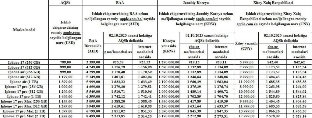 Божхона қўмитаси маълумотларига кўра, "iPhone 17" моделини божхона расмийлаштиришда қўлланилаётган қийматлар фуқаролар уни асосан олиб келаётган давлатлар кесимида аниқланмоқда.