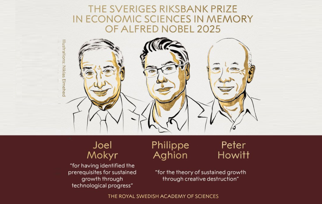 2025 йил учун иқтисодиёт бўйича Нобель мукофоти АҚШ, Франция ва Канада олимлари – Жоэль Мокир, Филипп Агийон ва Питер Ховиттга берилди. Улар инновация асосидаги иқтисодий ўсишни илмий нуқтаи назардан изоҳлаб берганликлари учун мазкур совринга лойиқ топилди. Бу ҳақда Швеция Қироллиги Фанлар академияси маълум қилди.