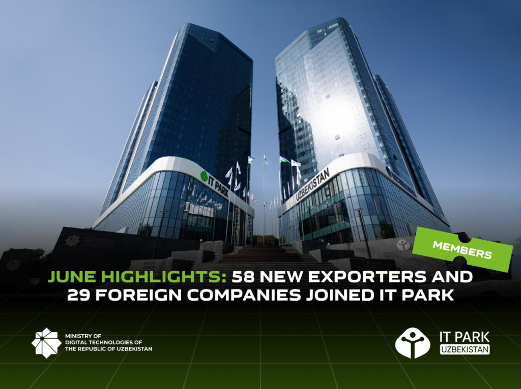 Жорий йилнинг июнь ойида IT-Парк резиденти мақомини олган 58 та экспортга йўналтирилган компаниянинг 29 таси Индонезия, Туркия, БАА, Руминия, Португалия, Венгрия ва Япония каби давлатларнинг хорижий капитали иштирокидаги компаниялардир.