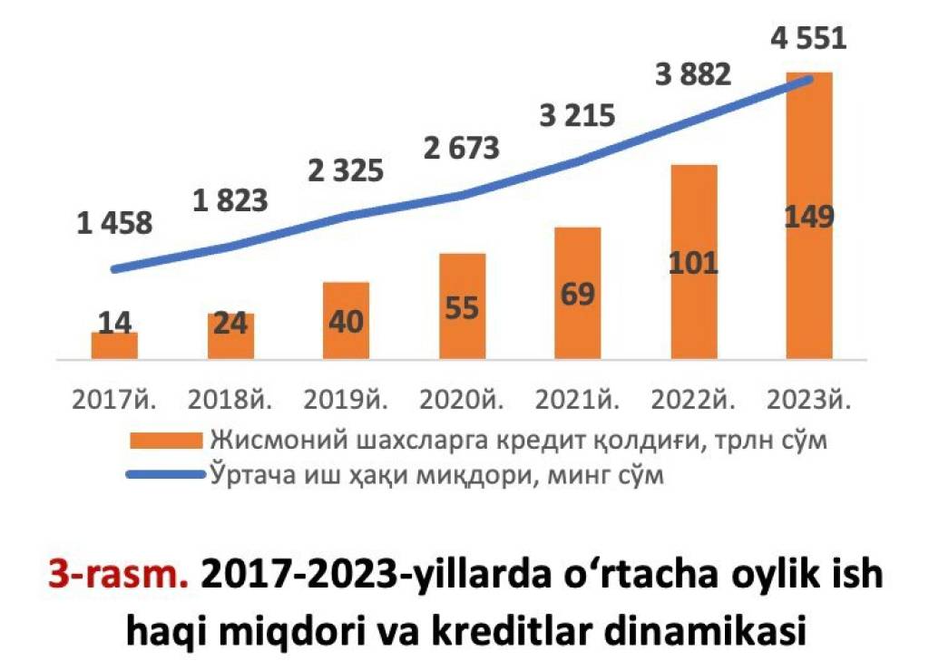 Умуман олганда аҳоли даромадларининг ошиши кредитлар ҳажмининг ўсишига замин яратиб, жисмоний шахсларга ажратилган кредит қолдиғи 2017 йилдаги 14 триллион сўмдан 2023 йилда 150 триллион сўмга етди ёки 11 баробарга ошди.