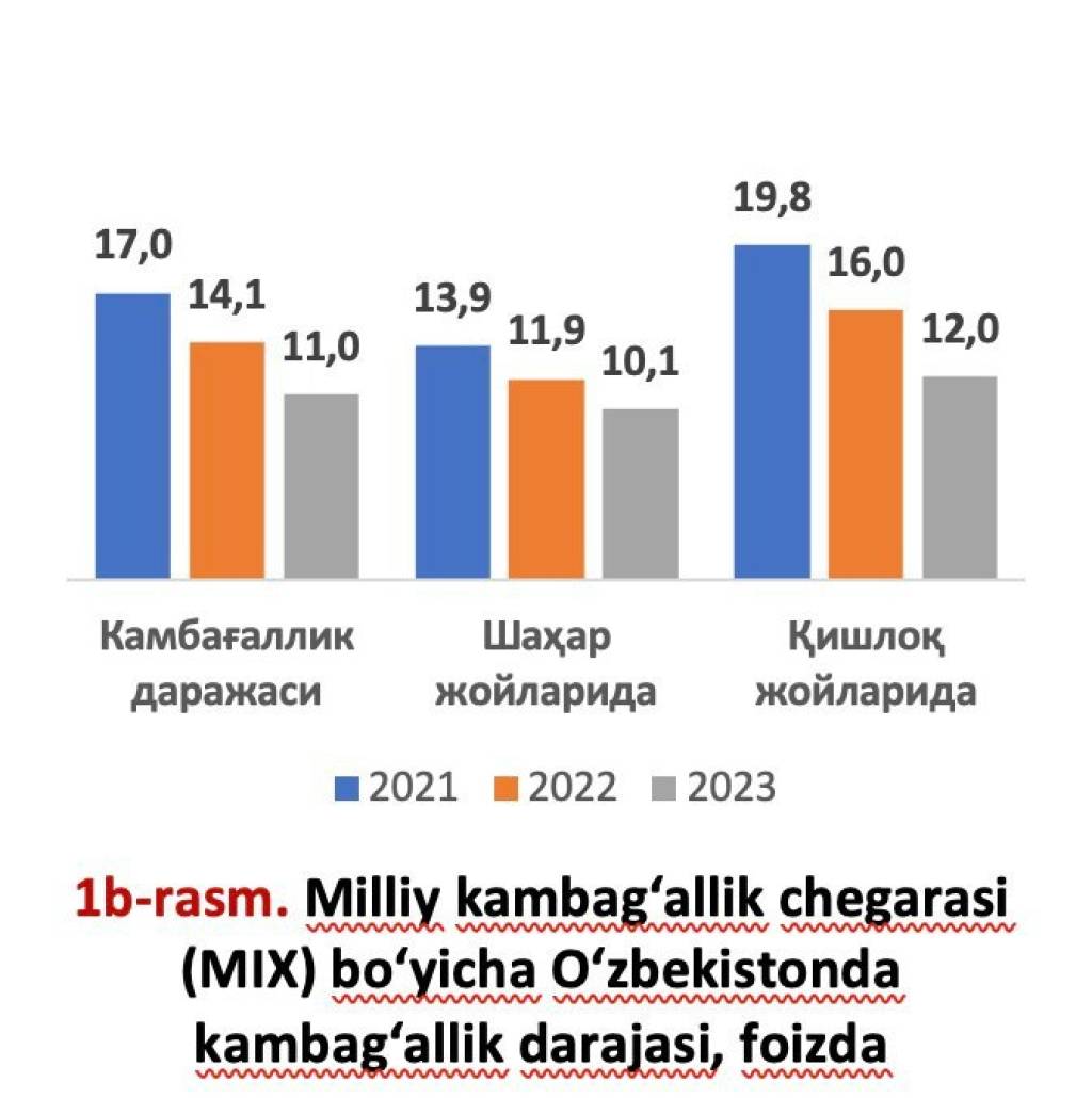 Шу билан бирга, ҳисоботда миллий камбағаллик чегараси 2021 йилдаги 17 фоиздан 2023 йилда 11 фоизгача пасайгани таъкидланган. Жумладан, 2021-2023 йилларда қишлоқ жойларида 1,2 миллион аҳоли ва шаҳарларда 400 минг аҳоли камбағалликдан чиқарилган.
